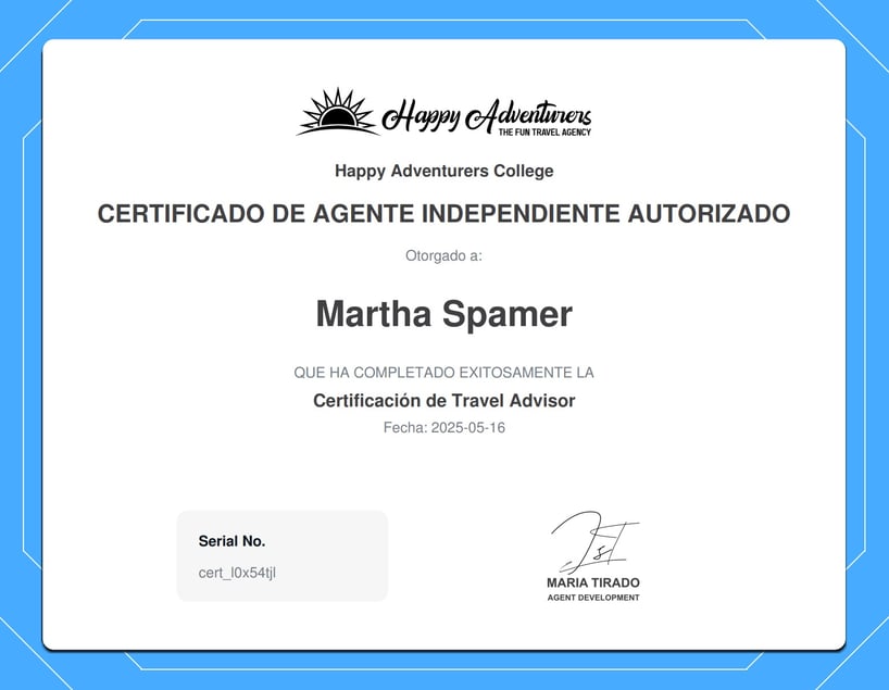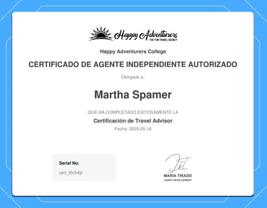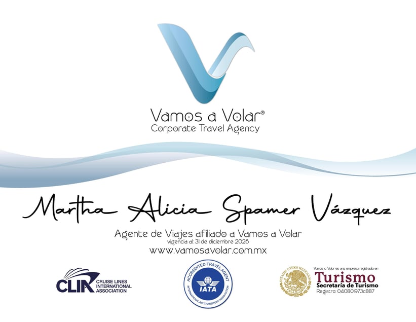 Aquí comienza la aventura hacia el viaje de tus sueños. Soy Martha y te acompaño paso a paso para que vivas experiencias únicas, sin estrés y con la tranquilidad de tener a una experta a tu lado. Soy agente Certificada y mi servicio es 100% personalizado y sin costo extra para ti. Cada destino, cada detalle y cada momento están planeados con cariño y dedicación para que solo te ocupes de disfrutar. Trabajamos con una red de operadores mayoristas certificados que nos permiten acceder a tarifas preferenciales y emisión directa con proveedores internacionales.